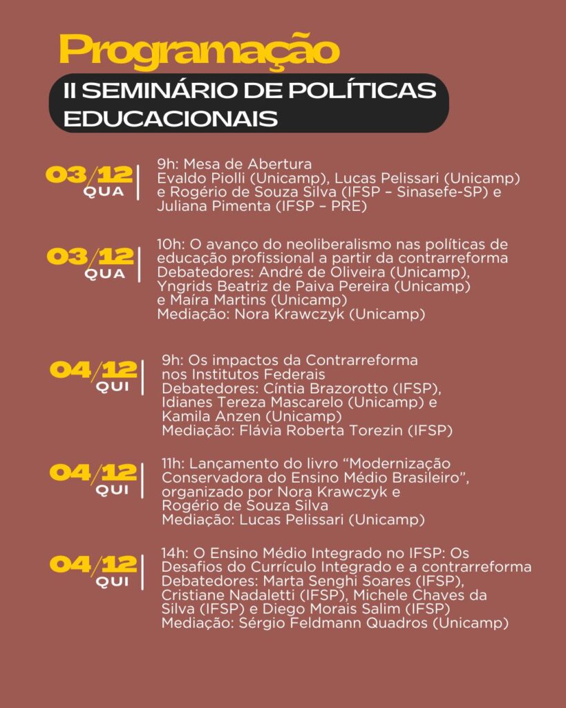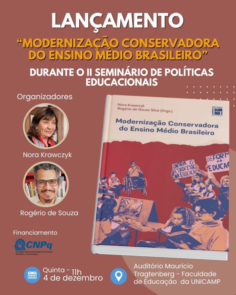Destaque especial: no dia 4 de dezembro, às 11h, será lançado o livro “Modernização Conservadora do Ensino Médio Brasileiro”, organizado por Nora Krawczyk (Unicamp) e Rogério de Souza Silva, da Coordenação Funcional do Sinasefe-SP, uma contribuição fundamental para compreender os rumos e disputas em torno das políticas educacionais no país.