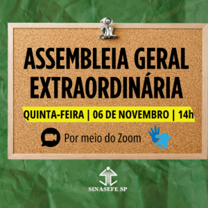 Na próxima quinta-feira, 6 de novembro, a partir das 14h, ocorre a Assembleia Geral Extraordinária (AGE) do Sindicato Nacional dos Servidores Federais da Educação Básica, Profissional e Tecnológica – Seção Sindical São Paulo (Sinasefe-SP), por meio da plataforma Zoom. A...
