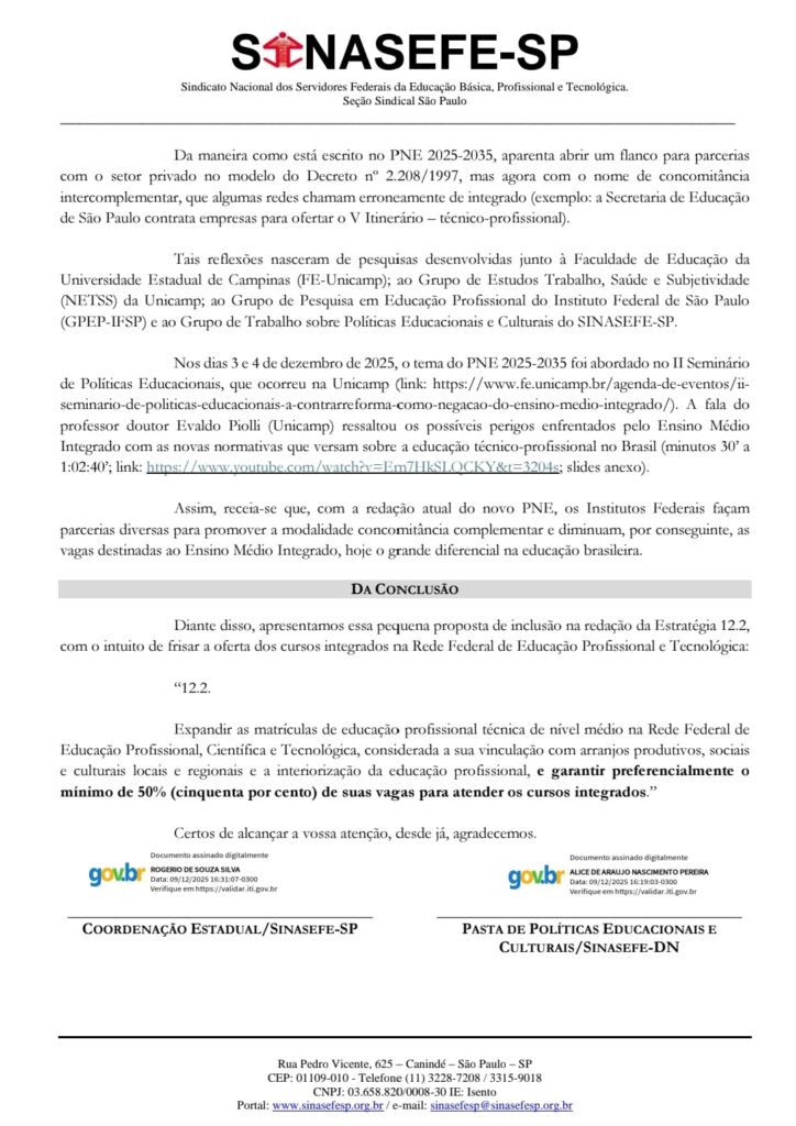 O ofício também foi fundamentado em pesquisas da Unicamp e de grupos do IFSP, que identificam riscos estruturais nas recentes normativas de educação técnico-profissional. Por isso, o Sinasefe-SP defendeu que o PNE estabelecesse, de forma explícita, que pelo menos 50% das vagas da Rede Federal sejam destinadas aos cursos integrados, preservando o principal diferencial pedagógico e social dos Institutos Federais.