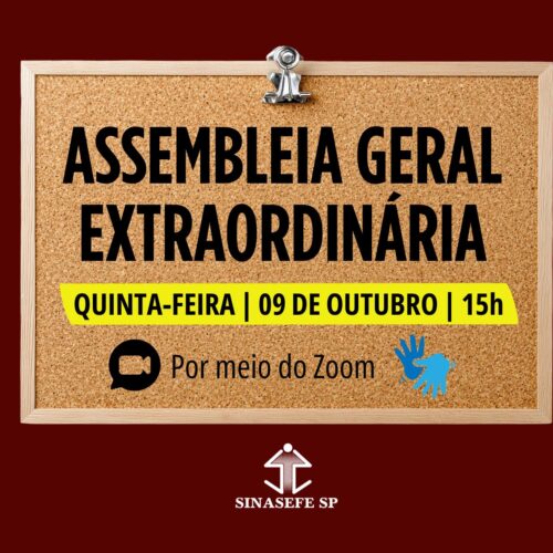 Na próxima quinta-feira, 9 de outubro, a partir das 15h, ocorre a Assembleia Geral Extraordinária do Sindicato Nacional dos Servidores Federais da Educação Básica, Profissional e Tecnológica – Seção Sindical São Paulo (Sinasefe-SP), por meio da plataforma Zoom.