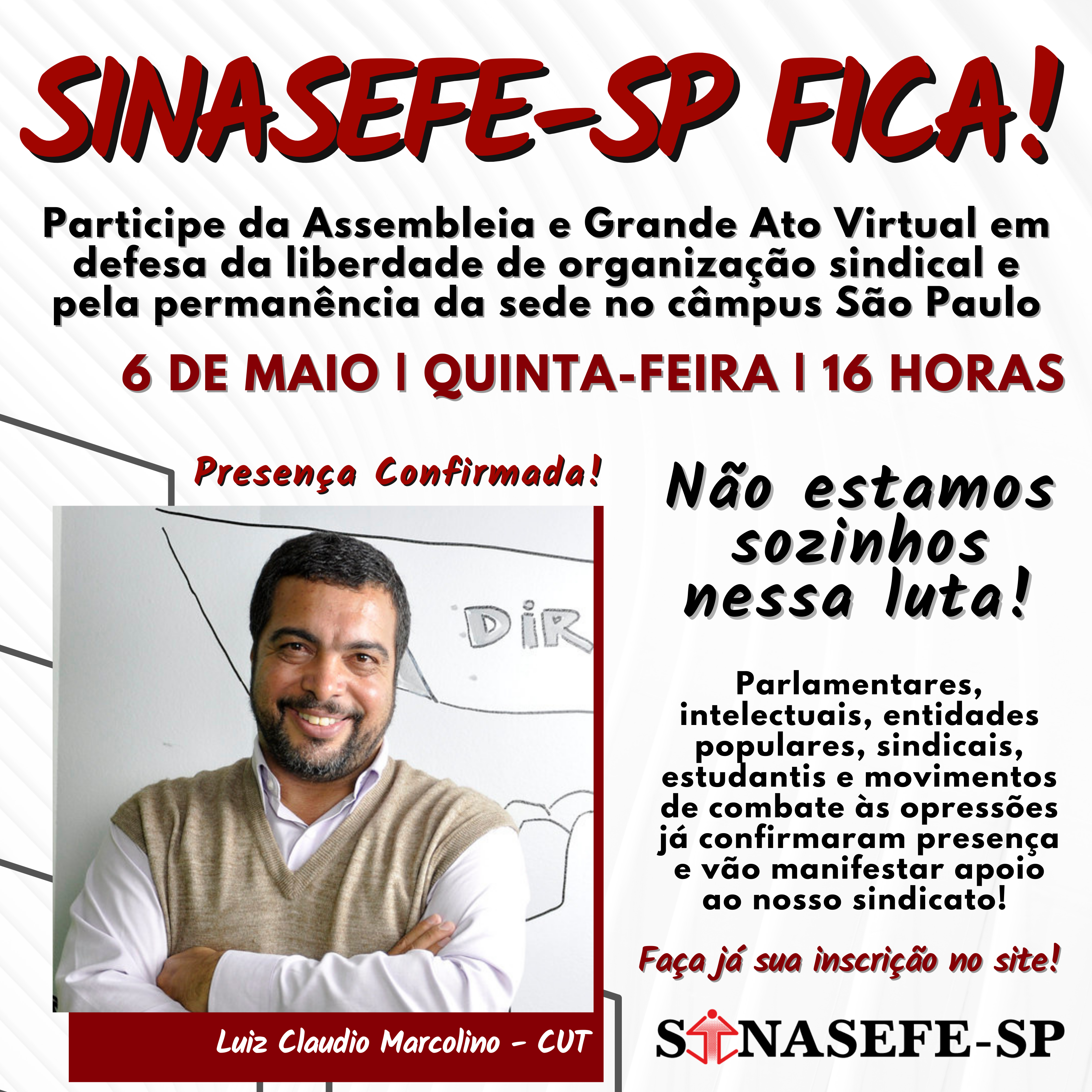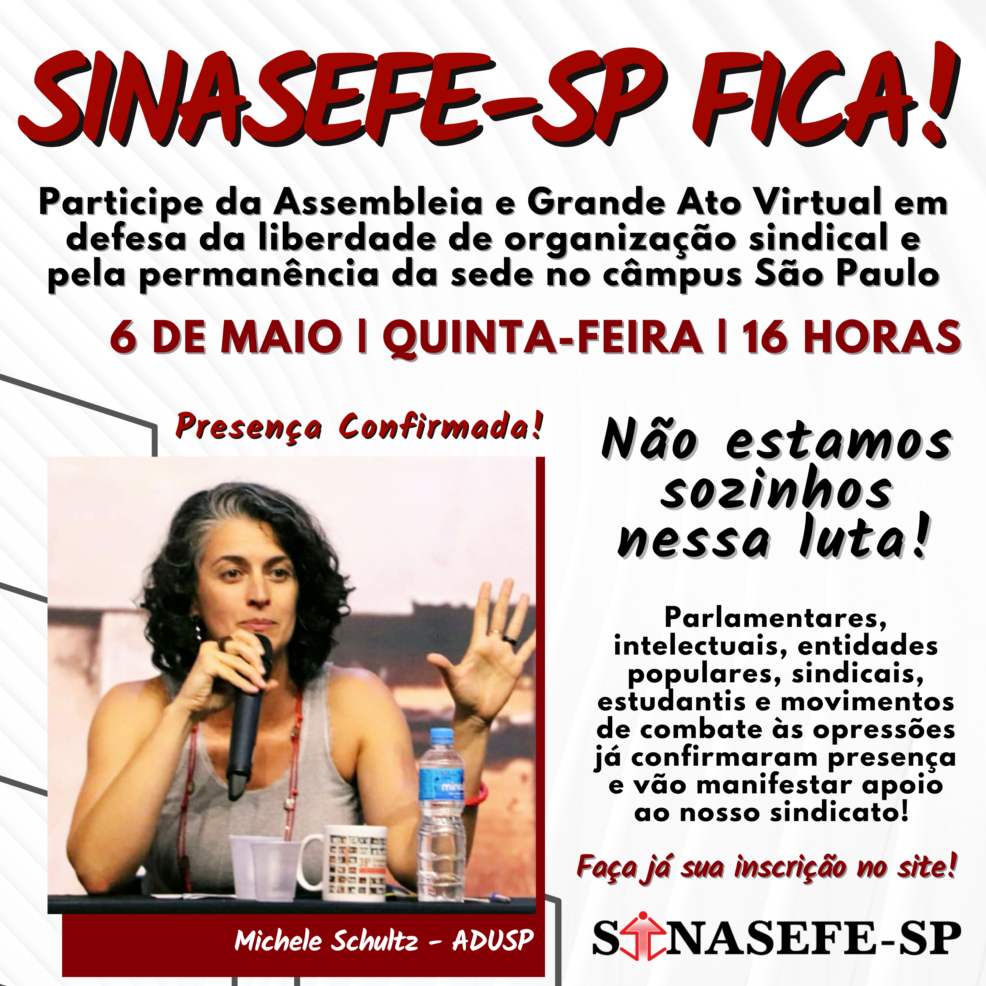 Não estamos sozinhos nessa luta! Nesta quinta-feira, 6 de maio, nossa assembleia será também um grande ato político. Parlamentares, intelectuais, entidades populares, sindicais, estudantis e movimentos de combate às opressões já confirmaram presença e vão manifestar apoio ao nosso sindicato. A nossa resistência já começou: O Sinasefe-SP fica!